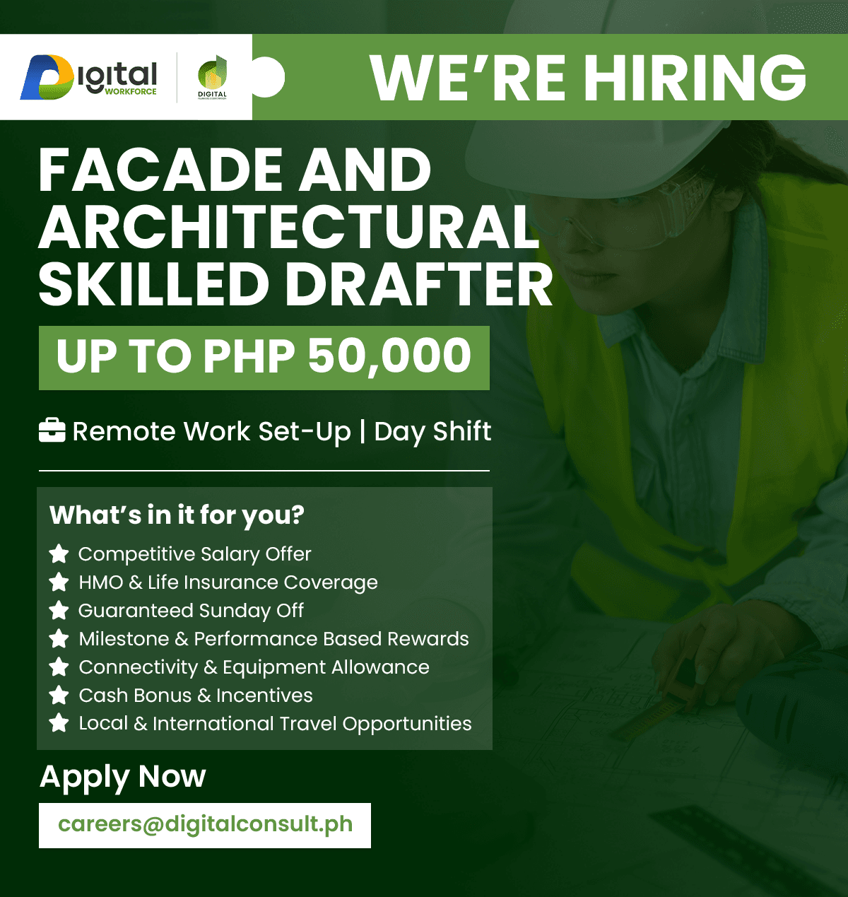 To apply, send your CV and portfolio to 📧 joan@digitalconsult.ph with the subject line [Your Name - Facade and Architectural Skilled Drafter].
