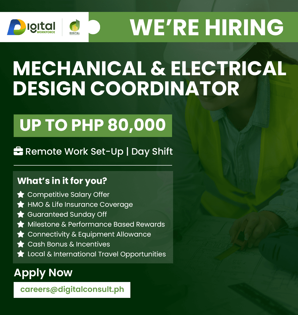 To apply, send your CV and portfolio to 📧 joan@digitalconsult.ph with the subject line [Your Name - Mechanical & Electrical Design Coordinator].